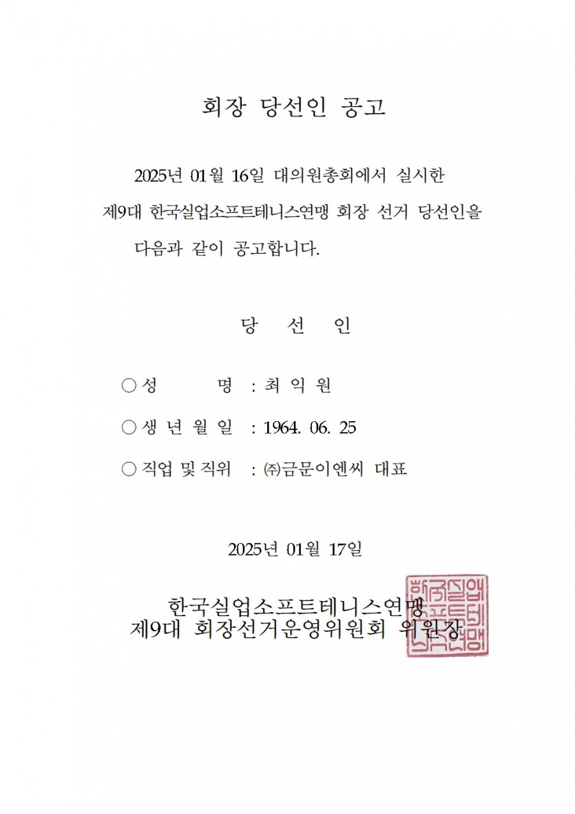 회장 당선인 공고 페이지 정보 작성자 실업연맹 작성일25-01-17 20:04 조회747회 댓글0건 첨부파일 관련링크 이전글 다음글 목록 답변 본문 파일 참조. 댓글목록 등록된 댓글이 없습니다. 이전글 다음글 목록 답변