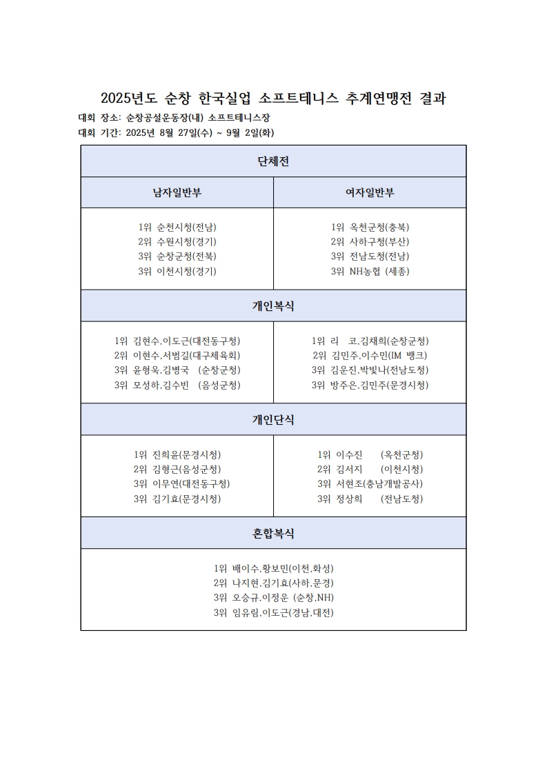 2025년도 순창 한국 실업 소프트테니스 추계연맹전 결과 페이지 정보 작성자 실업연맹 작성일25-09-06 15:31 조회645회 댓글0건 첨부파일 관련링크 다음글 목록 답변 본문 참조. 댓글목록 등록된 댓글이 없습니다. 다음글 목록 답변
